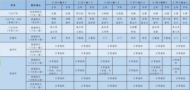 春节放假时间为:1月24—29日,在此期间急诊24小时值班,门诊值班情况如下:
