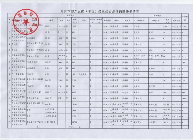 在举国上下抗击新型冠状病毒疫情的关键时期,社会各界的单位或个人及时伸出援助之手,积极捐赠防疫物资支援疫情防控工作。自开展抗击新冠病毒感染的肺炎疫情防控工作以来,从2020年1月28日至2020年3月5日,开封市妇产医院共计接受爱心捐赠物资17批,价值总计77394元。在此,我们表示最真诚的感谢和崇高的敬意,根据《开封市医院接受捐赠资助款物管理办法》规定,现对受捐财物进行公开公示并接受广大群众监督: