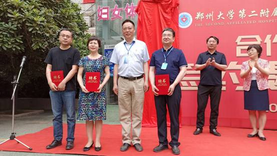 在热烈的掌声中,张栋梁、李新民、杜彦民、唐艳华、简立国、何继林共同为郑州大学第二附属医院 开封市妇产医院揭牌。